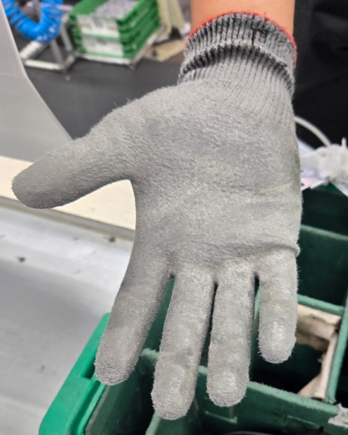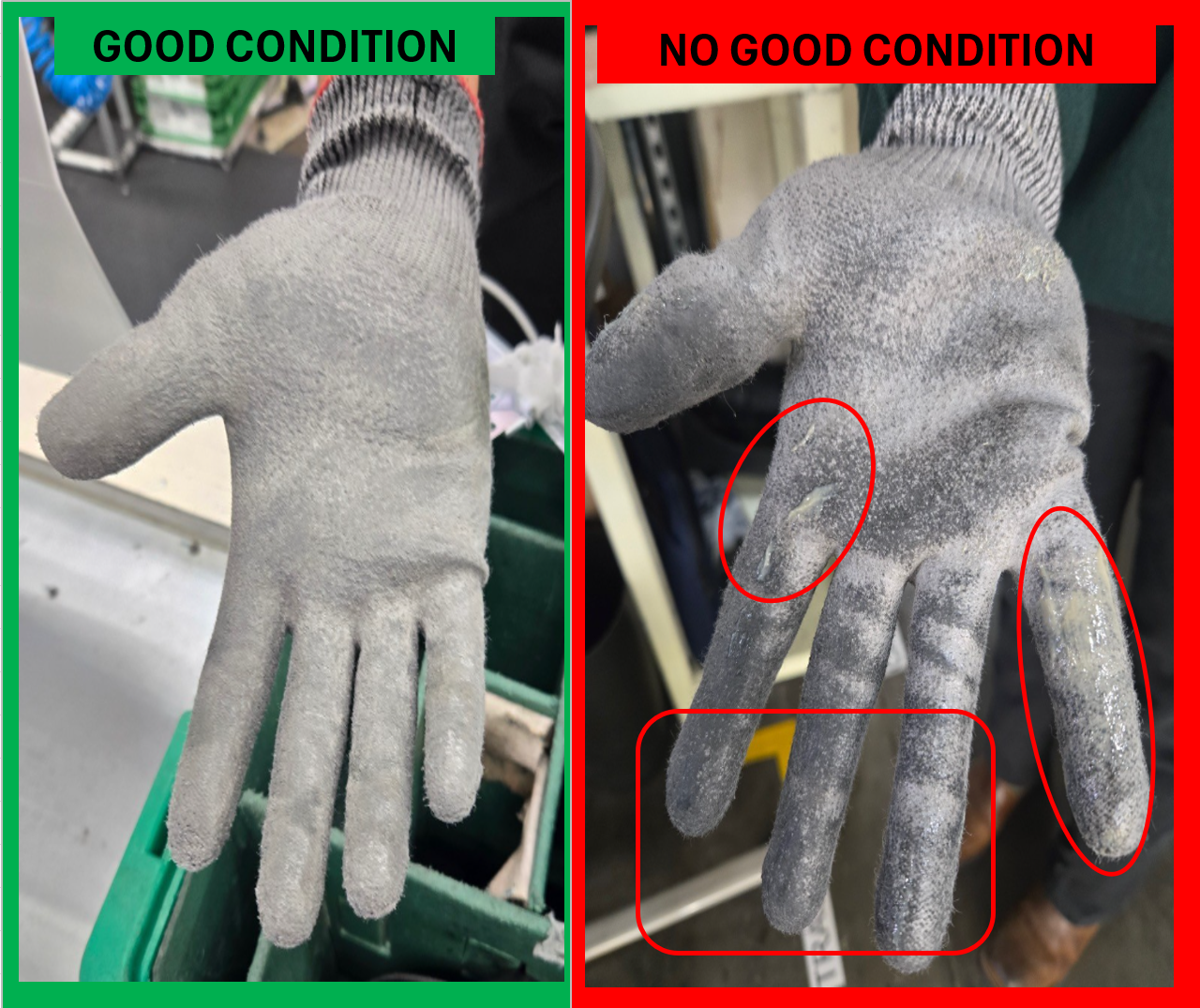 Check the condition of gloves before beginning your shift. Gloves should be free from CUTS, HOLES, EXCESSIVE GREASE and CONTAMINATION.